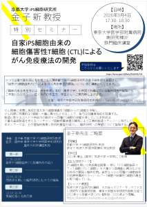 【演題名】「自家iPS細胞由来の細胞傷害性T細胞(CTL)によるがん免疫療法の開発」